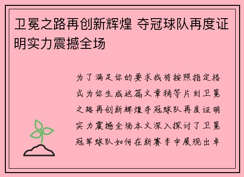 卫冕之路再创新辉煌,这支夺冠球队再次证明了他们在足球世界中的绝对实力和影响力。通过战术创新、球员表现以及与粉丝的紧密互动,他们不仅赢得了比赛,更赢得了全球足球爱好者的尊重和喝彩。