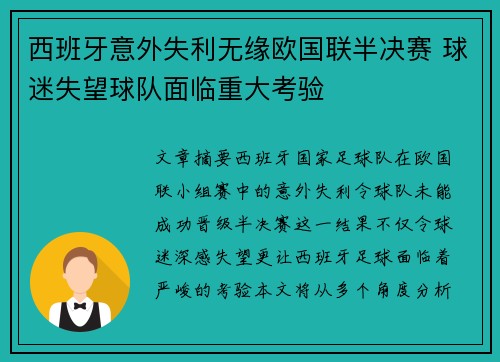 西班牙国家足球队在欧国联小组赛中的意外失利,令球队未能成功晋级半决赛。这一结果不仅令球迷深感失望,更让西班牙足球面临着严峻的考验。本文将从多个角度分析这一事件的影响与球队所面临的挑战。首先,文章将探讨西班牙队失利的原因,分析球队在比赛中的技术缺陷与战术失误;接着,探讨球迷的失望情绪以及球队与球迷关系的变化;然后,分析西班牙足球的现状和面临的未来挑战;最后,讨论西班牙如何调整并重建信心,以应对未来的比赛和竞争。通过这些方面的分析,本文试图呈现出西班牙足球在这场意外失利中的得失,揭示球队未来所需面对的重要课题。