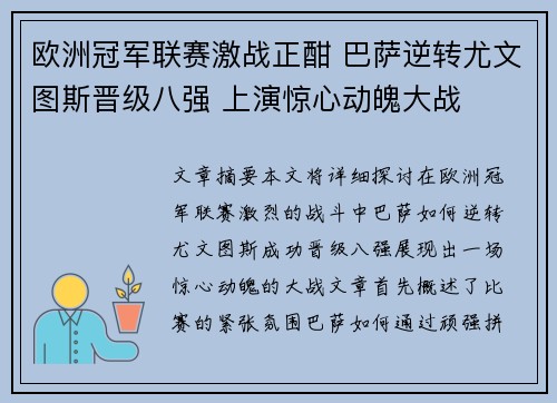 文章摘要:本文将详细探讨在欧洲冠军联赛激烈的战斗中,巴萨如何逆转尤文图斯成功晋级八强,展现出一场惊心动魄的大战。文章首先概述了比赛的紧张氛围,巴萨如何通过顽强拼搏扭转局势,最终逆袭尤文图斯的精彩过程。接着,从比赛的关键时刻、球员的关键表现、战术的变化以及赛后反响四个方面进行深度分析,逐步揭示比赛的精彩细节。通过这些角度的剖析,本文不仅展现了巴萨逆转的壮丽画面,还反映出欧洲足球顶级赛事的魅力和不可预测性。最后,本文总结了这场比赛对于巴萨未来征程的重要意义,以及如何在逆境中展现强大球队精神的深远影响。