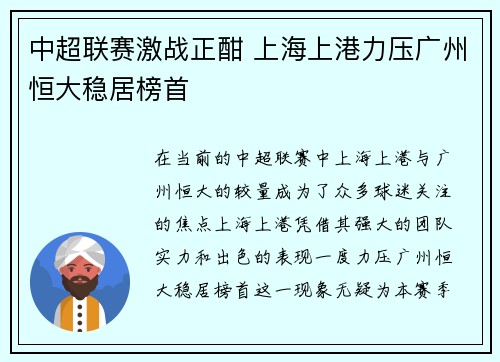 在当前的中超联赛中,上海上港与广州恒大的较量成为了众多球迷关注的焦点。上海上港凭借其强大的团队实力和出色的表现,一度力压广州恒大稳居榜首,这一现象无疑为本赛季的中超增添了不少看点。本文将从多个方面对上海上港如何稳居榜首,以及广州恒大如何在竞争中不断追赶进行详细分析。我们将从球队实力、战术安排、球员表现、以及赛季趋势等四个角度,深入探讨上海上港和广州恒大的现状,并对本赛季中超联赛的激烈竞争局势做出总结。